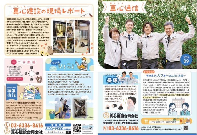9月のニュースレターです 2025.08.29 お知らせ 9月初旬、チラシとニュースレターを文京区、豊島区、板橋区、新宿区を中心に配布いたします! 最新の情報が満載です。詳細は当社ウェブサイトをご覧ください。 お気軽にお問い合わせください! 前の記事へ« 東京ゼロエミポイント / 文京区でリフォームをご検討の方へ 次の記事へ10月のニュースレターです »